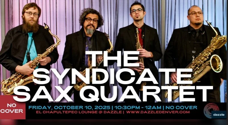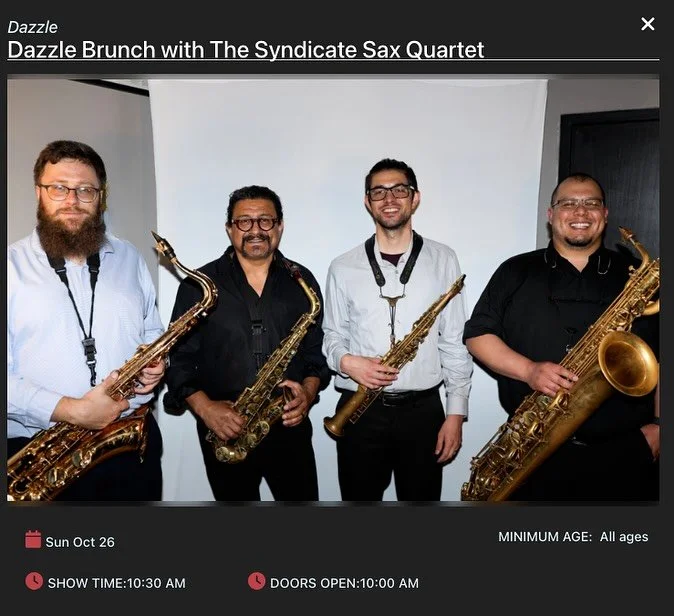 Hailing from diverse musical backgrounds and united by their shared passion for the saxophone, The Sax Syndicate is a dynamic and electrifying group that plays as a sextet, septet, or octet composed of three saxes up to a five-piece big band style saxophone section accompanied by a full rhythm section. Inspired by the iconic group, Supersax, The Sax Syndicate combines their individual virtuosity to create a seamless blend of harmonies, exhilarating solos, and infectious rhythms. Their repertoire includes jazz compositions and arrangements set in five-part harmony written by the likes of Gordon Goodwin, Benny Carter, Bob Mintzer, and many more.